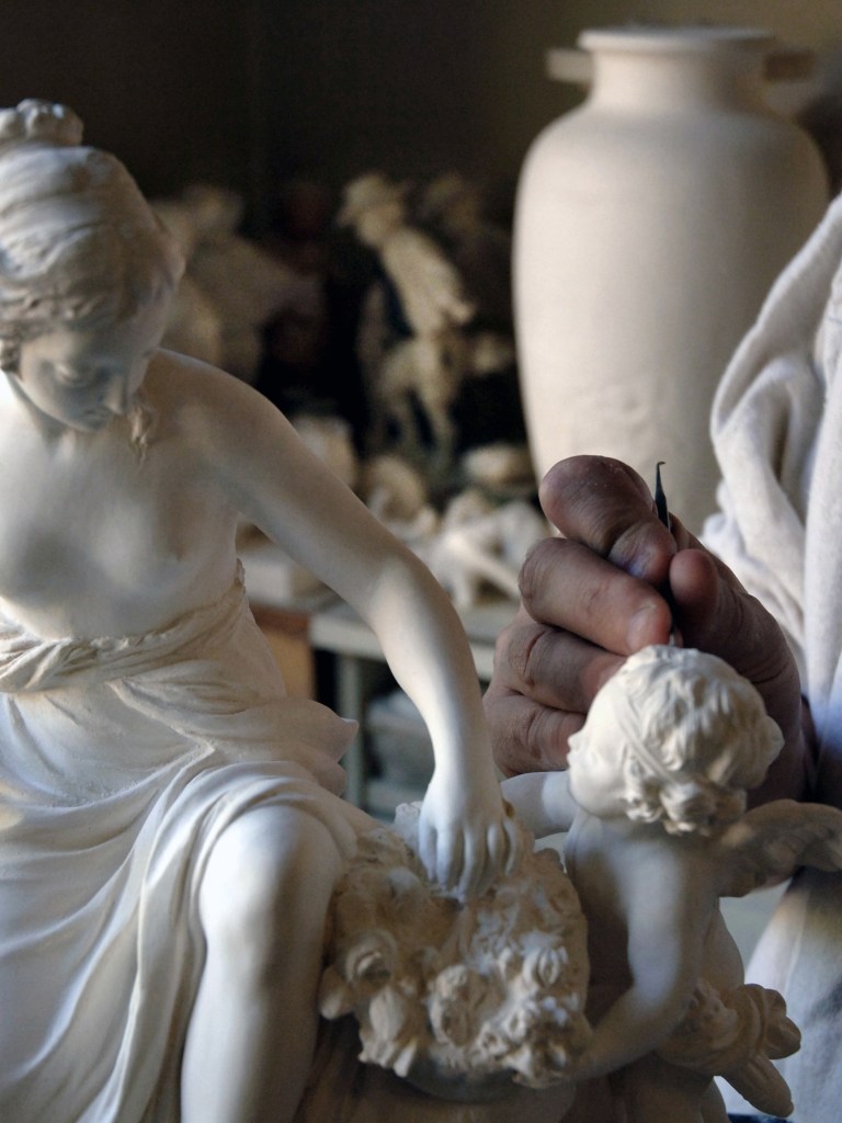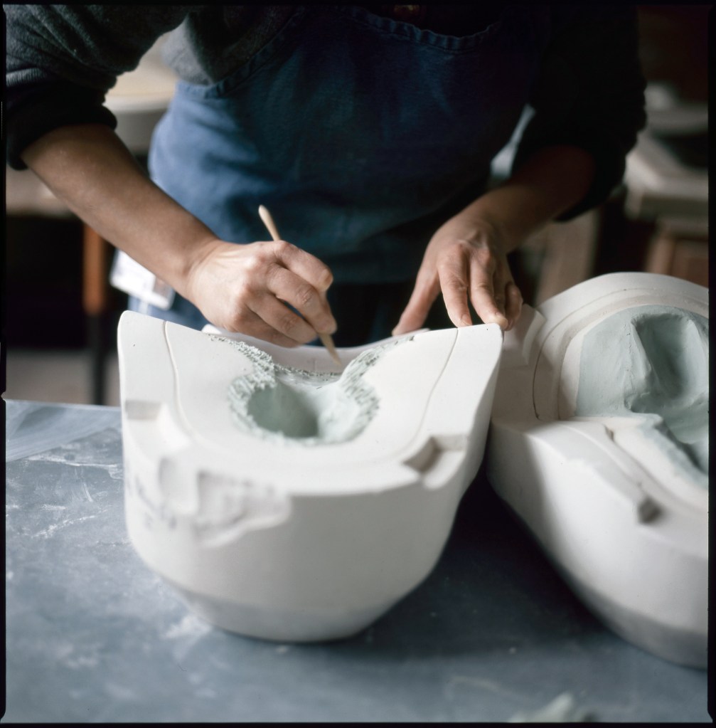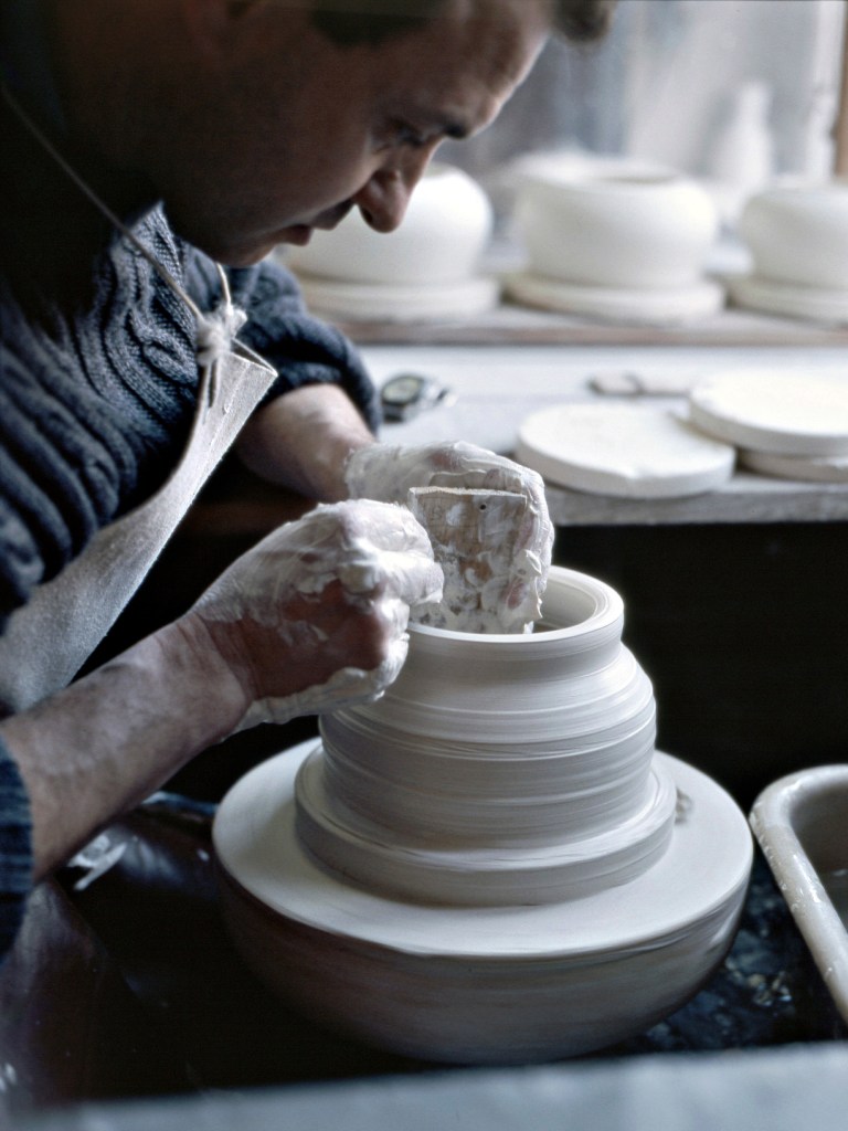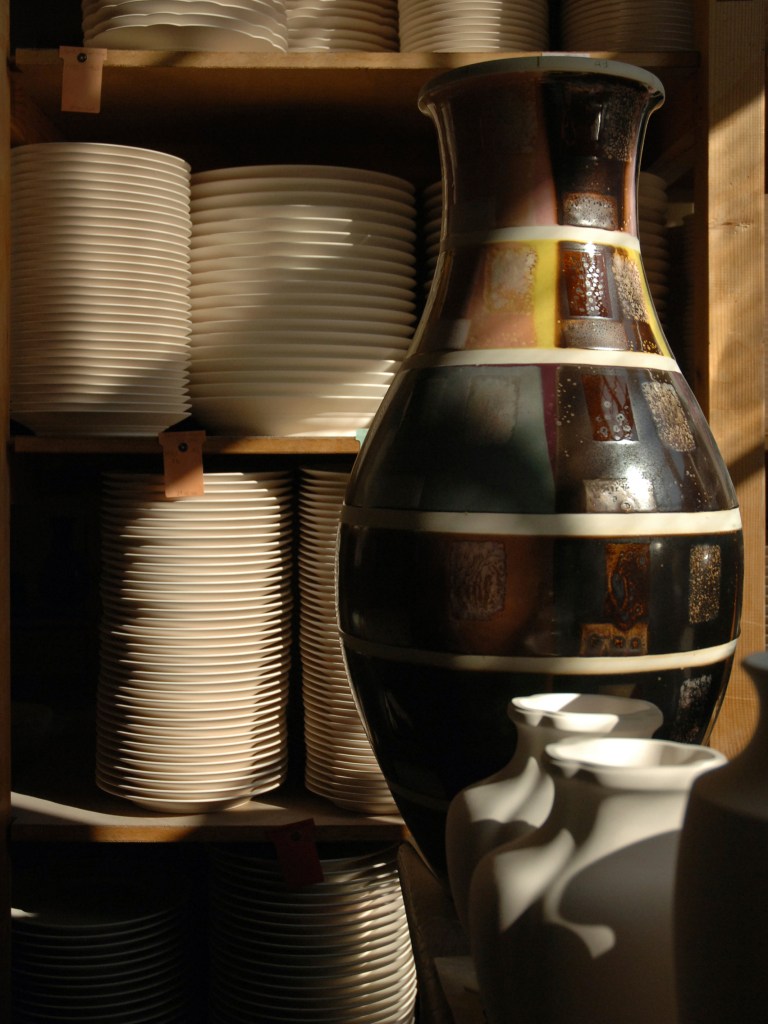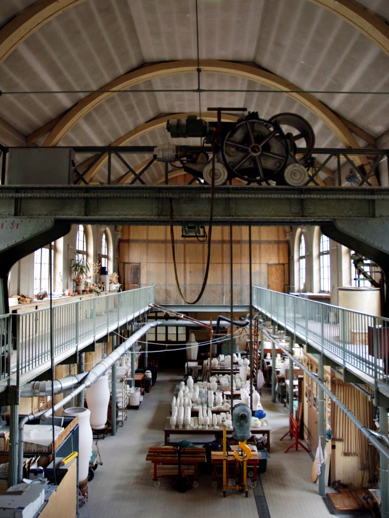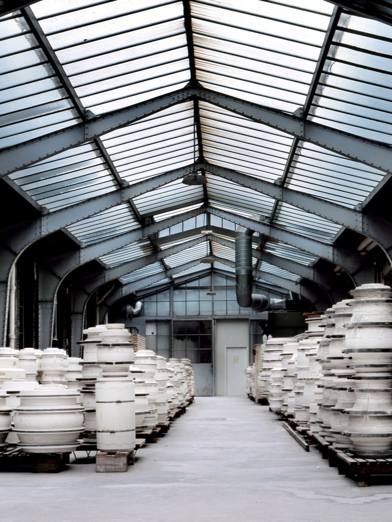 Des bâtiments de pierre, de brique et de verre, sont posés là. De calmes patios fleuris les séparent. Des tas de cailloux, des galeries de choses qui ressemblent à des fromages. Non! Ce sont des moules en plâtre, gardés comme un trésor dans cet endroit appelé le magot. De l’eau ruisselle. Le feulement d’un tour de potier. L’odeur de la terre blanche qui glisse mollement sur le sol. Des ombres dansent au fil d’allées claires ou obscures. D’un blanc immaculé surgissent, immobiles, des centaines de vases, de statues, d’assiettes, de tasses. Le souffle chaud du feu, l’odeur du bois. Une porte grince. Des couleurs explosent sans bruit. Le frémissement d’un pinceau. Les couleurs sentent bon. La pièce se joue sans relâche depuis deux siècles et demi. Les acteurs, ce sont ceux qui transforment les cailloux en or. L’alchimie est parfaite. Les gestes de Sèvres sont là, intacts, sans troubles.