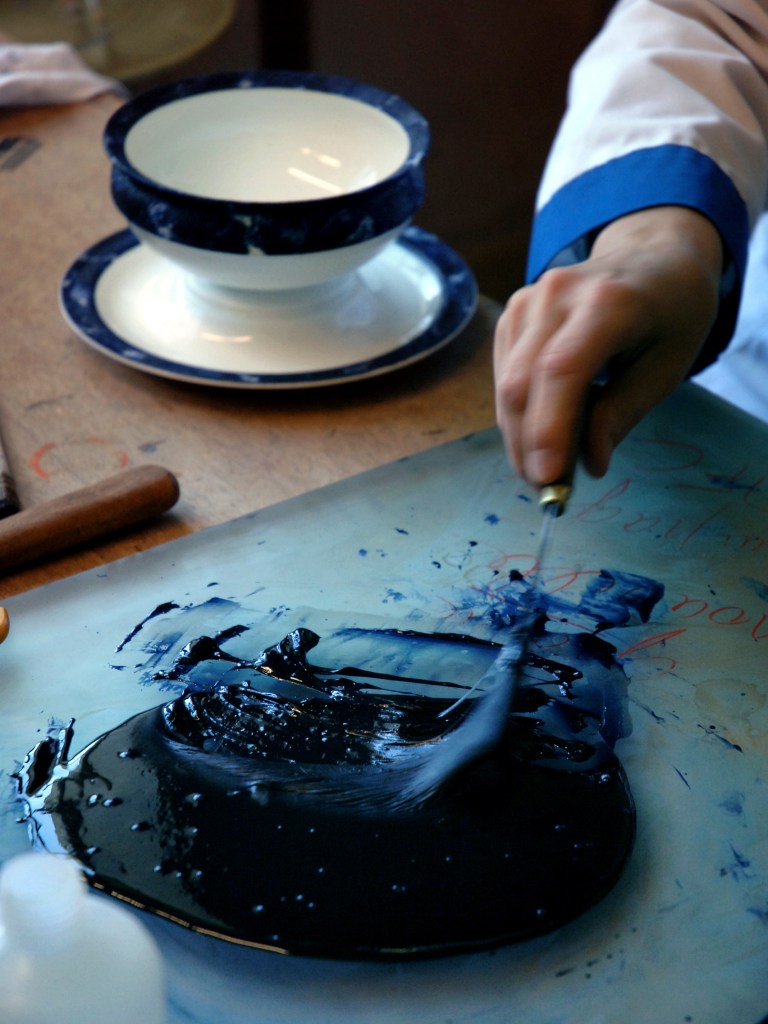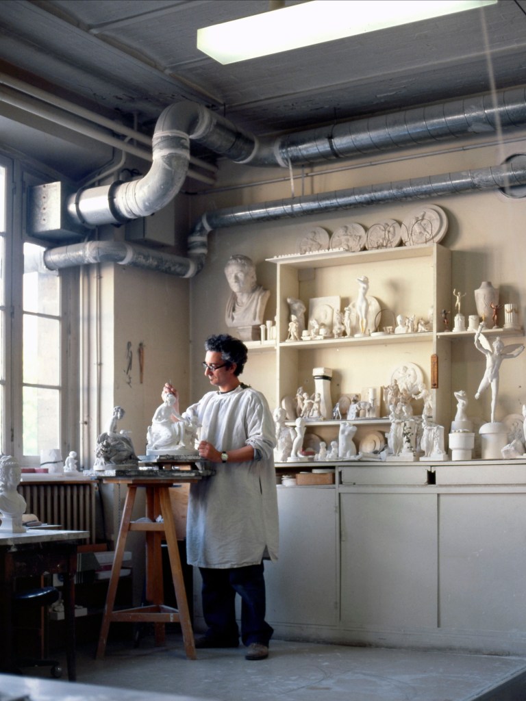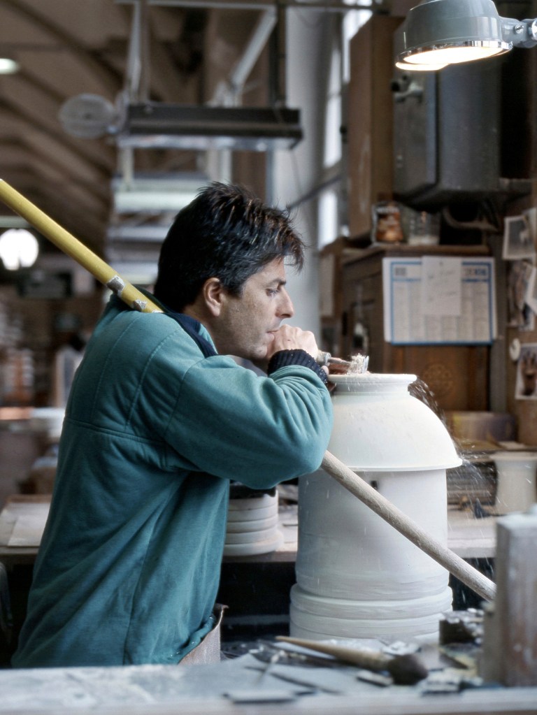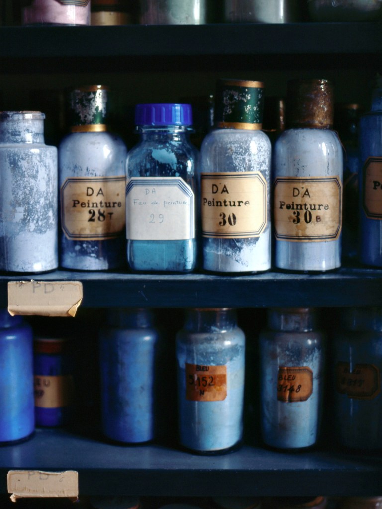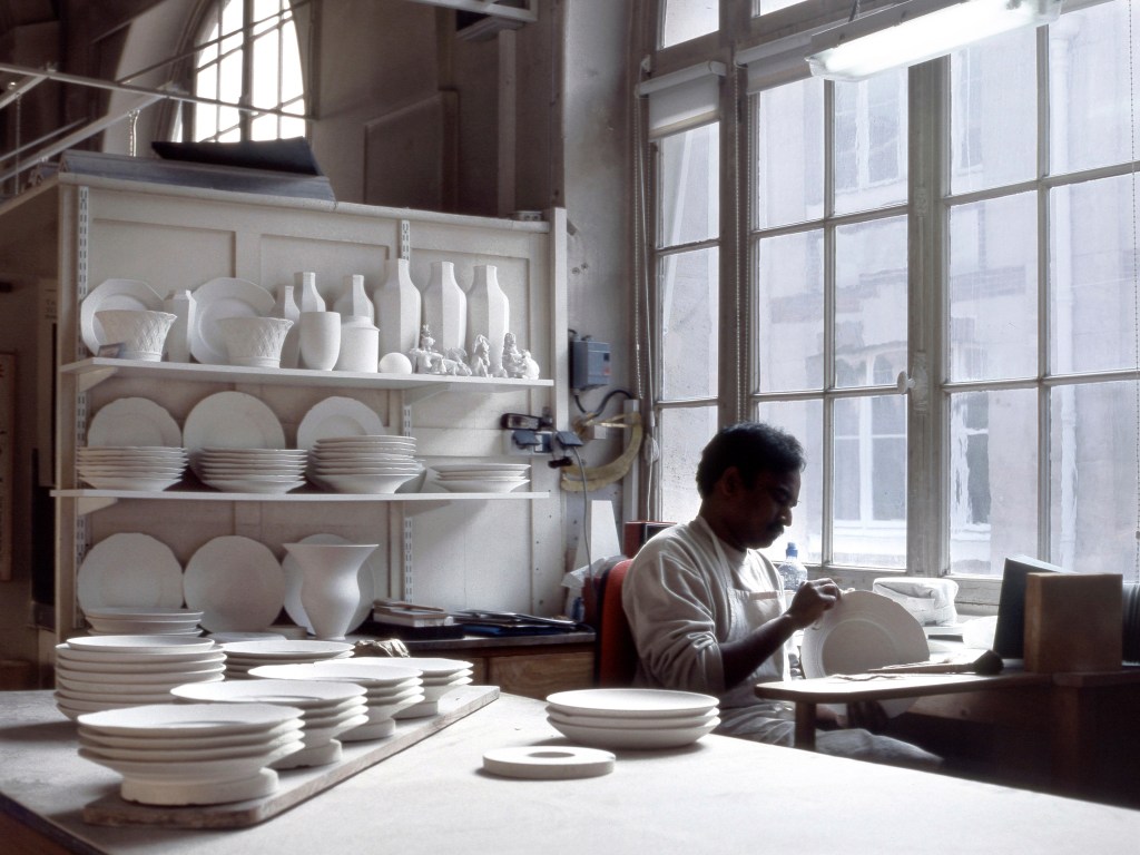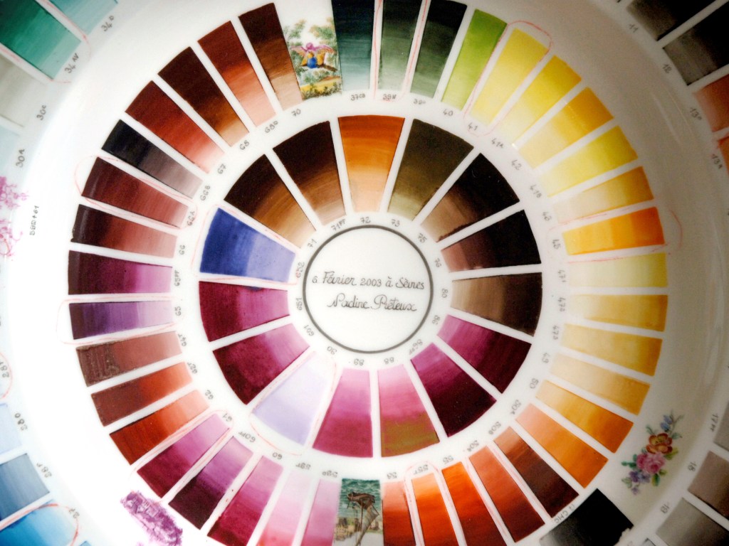 Des bâtiments de pierre, de brique et de verre, sont posés là. De calmes patios fleuris les séparent. Des tas de cailloux, des galeries de choses qui ressemblent à des fromages. Non! Ce sont des moules en plâtre, gardés comme un trésor dans cet endroit appelé le magot. De l’eau ruisselle. Le feulement d’un tour de potier. L’odeur de la terre blanche qui glisse mollement sur le sol. Des ombres dansent au fil d’allées claires ou obscures. D’un blanc immaculé surgissent, immobiles, des centaines de vases, de statues, d’assiettes, de tasses. Le souffle chaud du feu, l’odeur du bois. Une porte grince. Des couleurs explosent sans bruit. Le frémissement d’un pinceau. Les couleurs sentent bon. La pièce se joue sans relâche depuis deux siècles et demi. Les acteurs, ce sont ceux qui transforment les cailloux en or. L’alchimie est parfaite. Les gestes de Sèvres sont là, intacts, sans troubles.