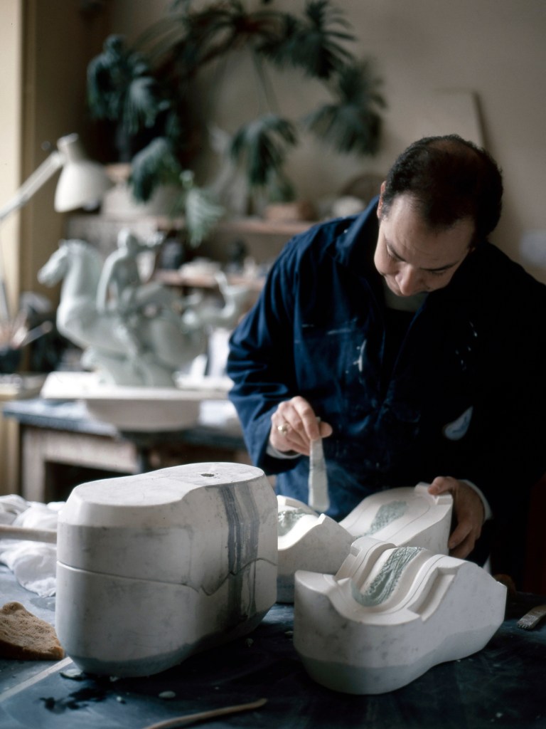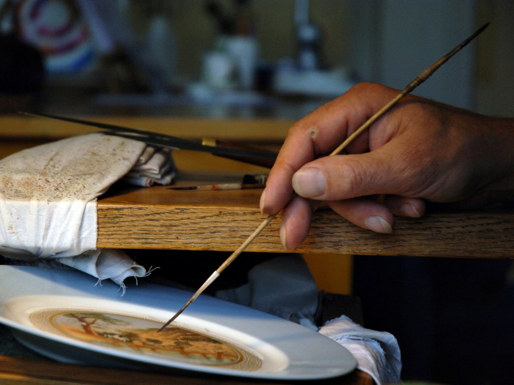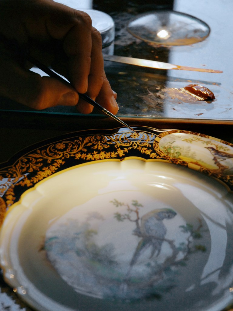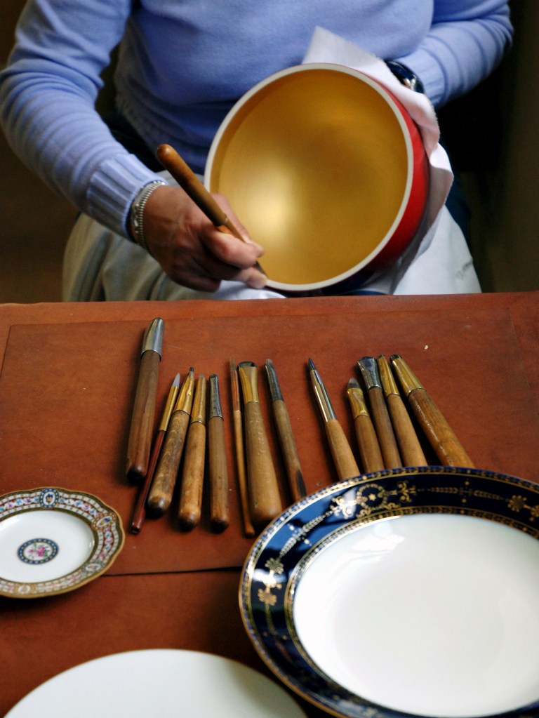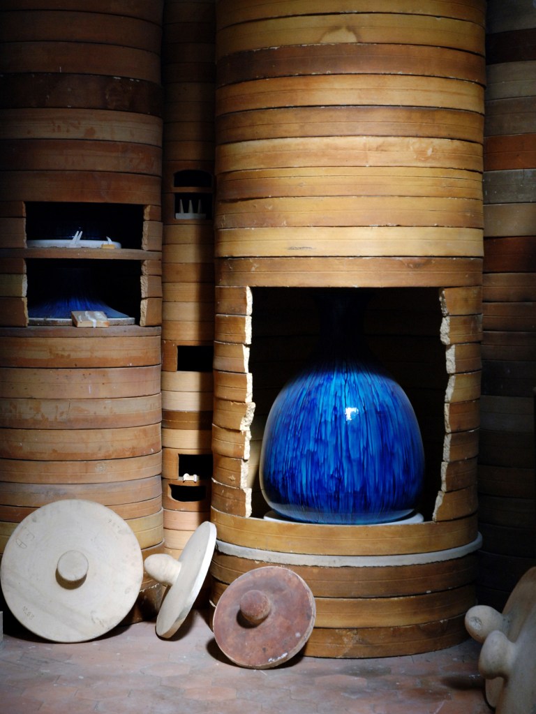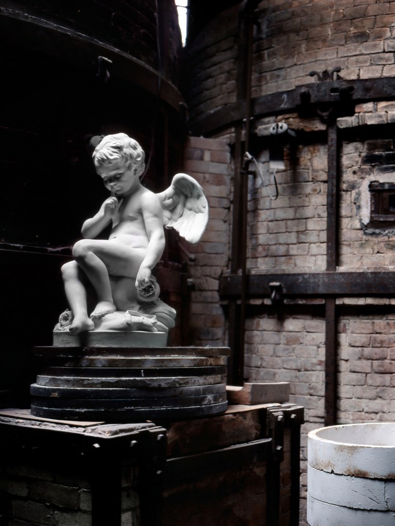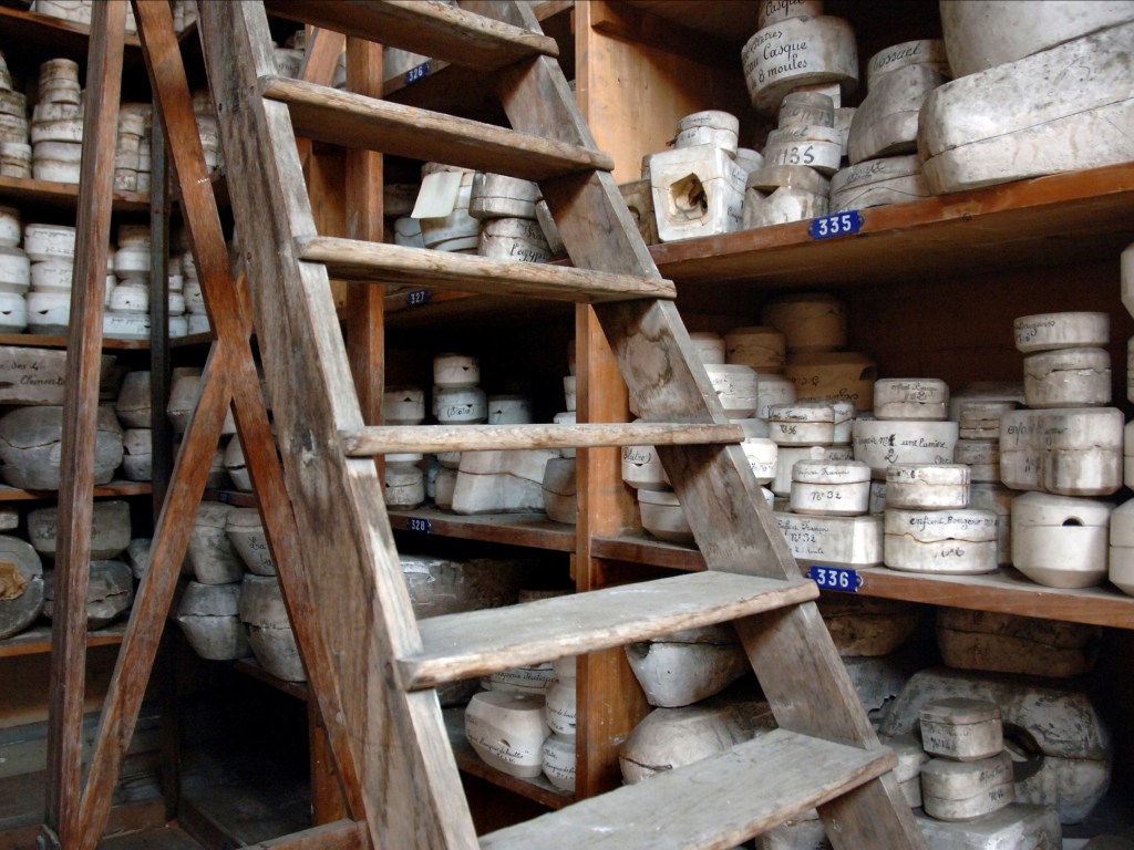 Des bâtiments de pierre, de brique et de verre, sont posés là. De calmes patios fleuris les séparent. Des tas de cailloux, des galeries de choses qui ressemblent à des fromages. Non! Ce sont des moules en plâtre, gardés comme un trésor dans cet endroit appelé le magot. De l’eau ruisselle. Le feulement d’un tour de potier. L’odeur de la terre blanche qui glisse mollement sur le sol. Des ombres dansent au fil d’allées claires ou obscures. D’un blanc immaculé surgissent, immobiles, des centaines de vases, de statues, d’assiettes, de tasses. Le souffle chaud du feu, l’odeur du bois. Une porte grince. Des couleurs explosent sans bruit. Le frémissement d’un pinceau. Les couleurs sentent bon. La pièce se joue sans relâche depuis deux siècles et demi. Les acteurs, ce sont ceux qui transforment les cailloux en or. L’alchimie est parfaite. Les gestes de Sèvres sont là, intacts, sans troubles.