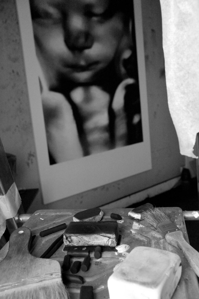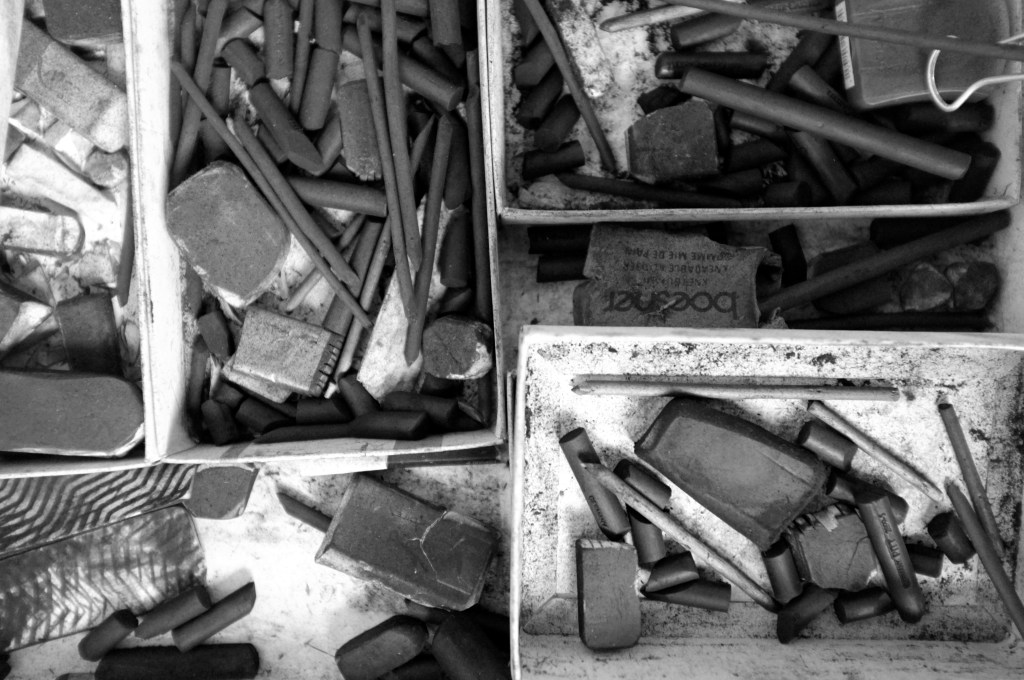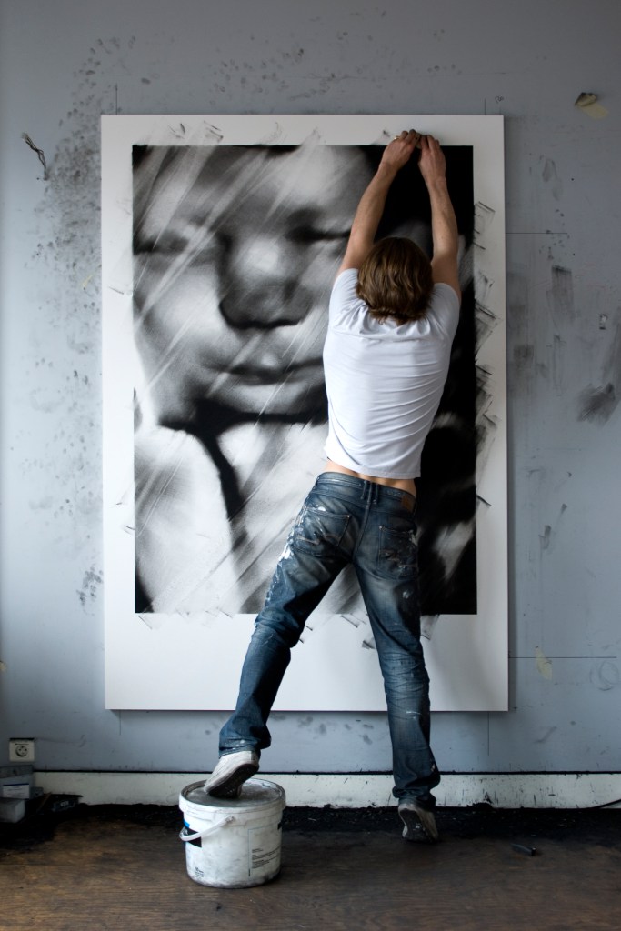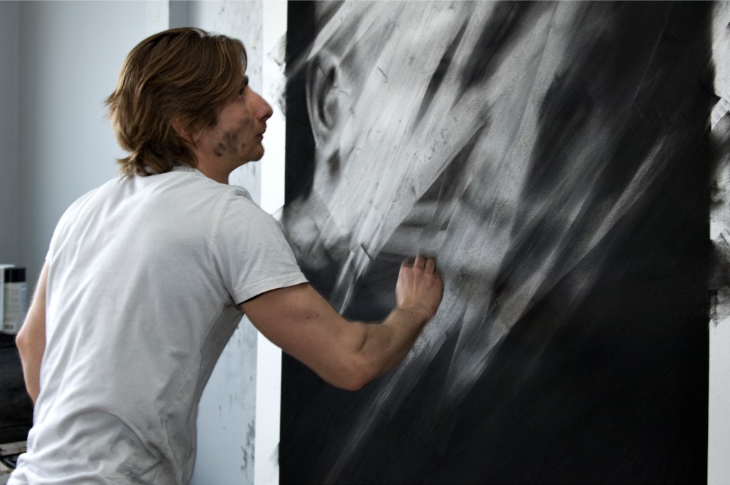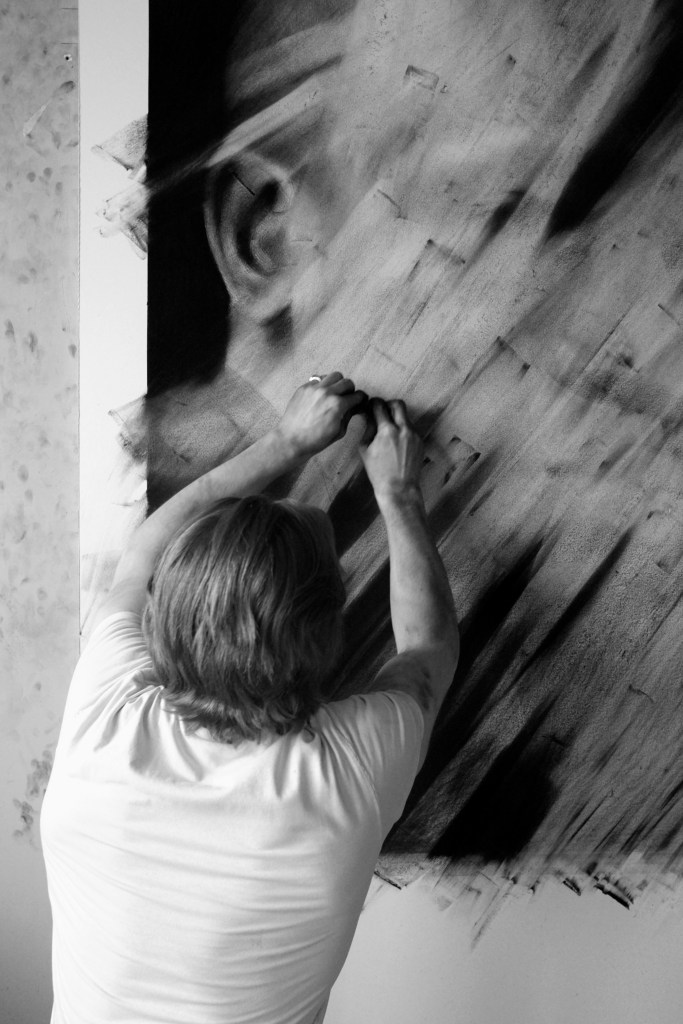 In a first step, to work from images of print media or internet, including sometimes images of his private sphere, big drawings represent mainly individuals on a black background. These drawings made with charcoal and black stone seem to lose any context in the image and its subject. The spectator who can’t anymore connect them with a precise event or with news which the image in its origin was supposed to represent.